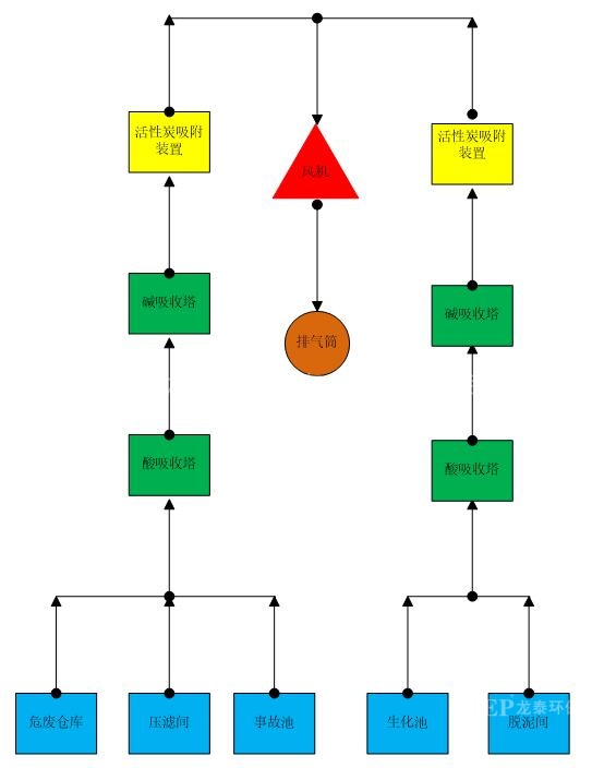 - 危廢倉(cāng)庫(kù)、壓濾間、以及事故池共用一套處理系統(tǒng),處理工藝為酸吸收、堿吸收以及活性炭吸附裝置(在堿吸收塔中加入次氯酸鈉)。